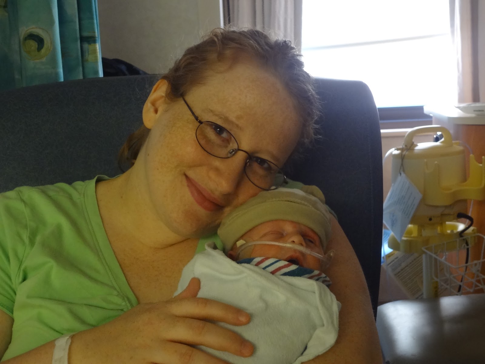 He still has a little ways to go, though. He turns three weeks old today, and he only started to eat by mouth yesterday. Since beginning to take food, he has gotten milk thru a feeding tube that goes through his nose and down to his stomach. He has been tolerating the bottle well since last night, and started with a very small amount but has since increased his intake. Also, there is a line still in his arm. A day or so after the painkiller is off, he can get that out. We are hopeful that we can get him home by his original due date, June 1.